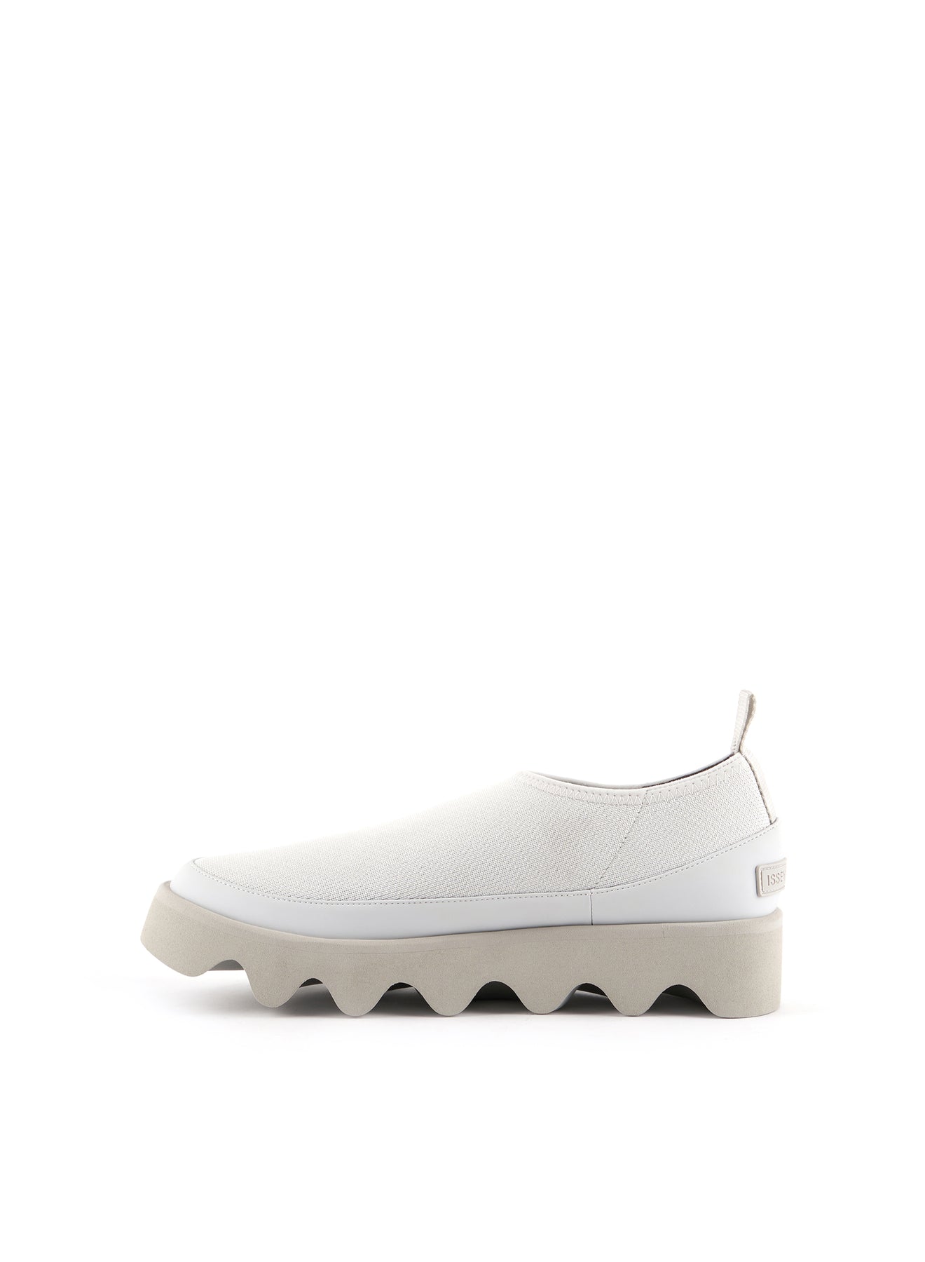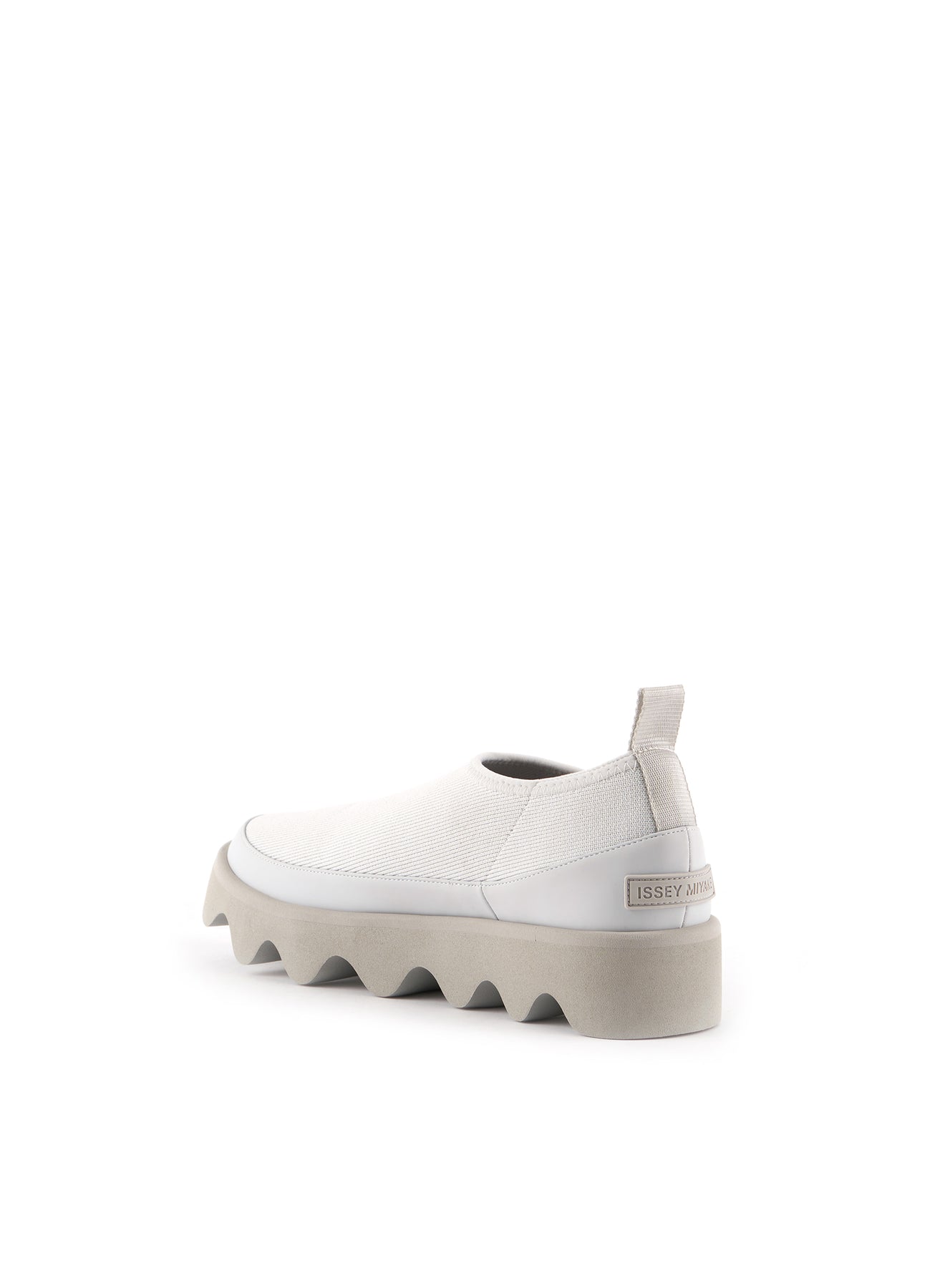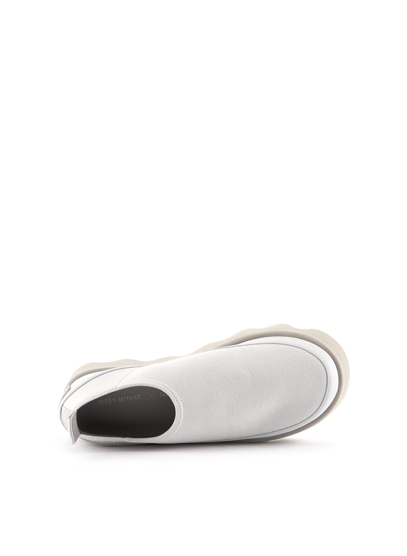 Der Bounce Fit 2 ist ein Slip-on-Sneaker mit einem recycelten Strick-Obermaterial und einer markanten, wellenförmigen Chunky-Sohle. Das Modell kehrt als Low-Top-Version zurück und zeigt seine vertrauten, tonalen Lederdetails, eine Zuglasche für leichtes Anziehen sowie das Issey-Miyake-Logo an der Ferse.