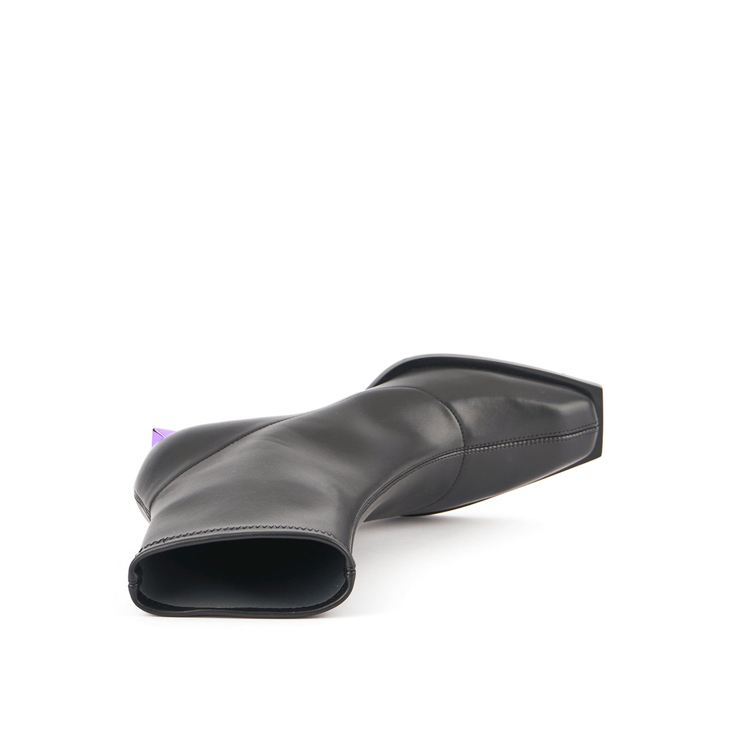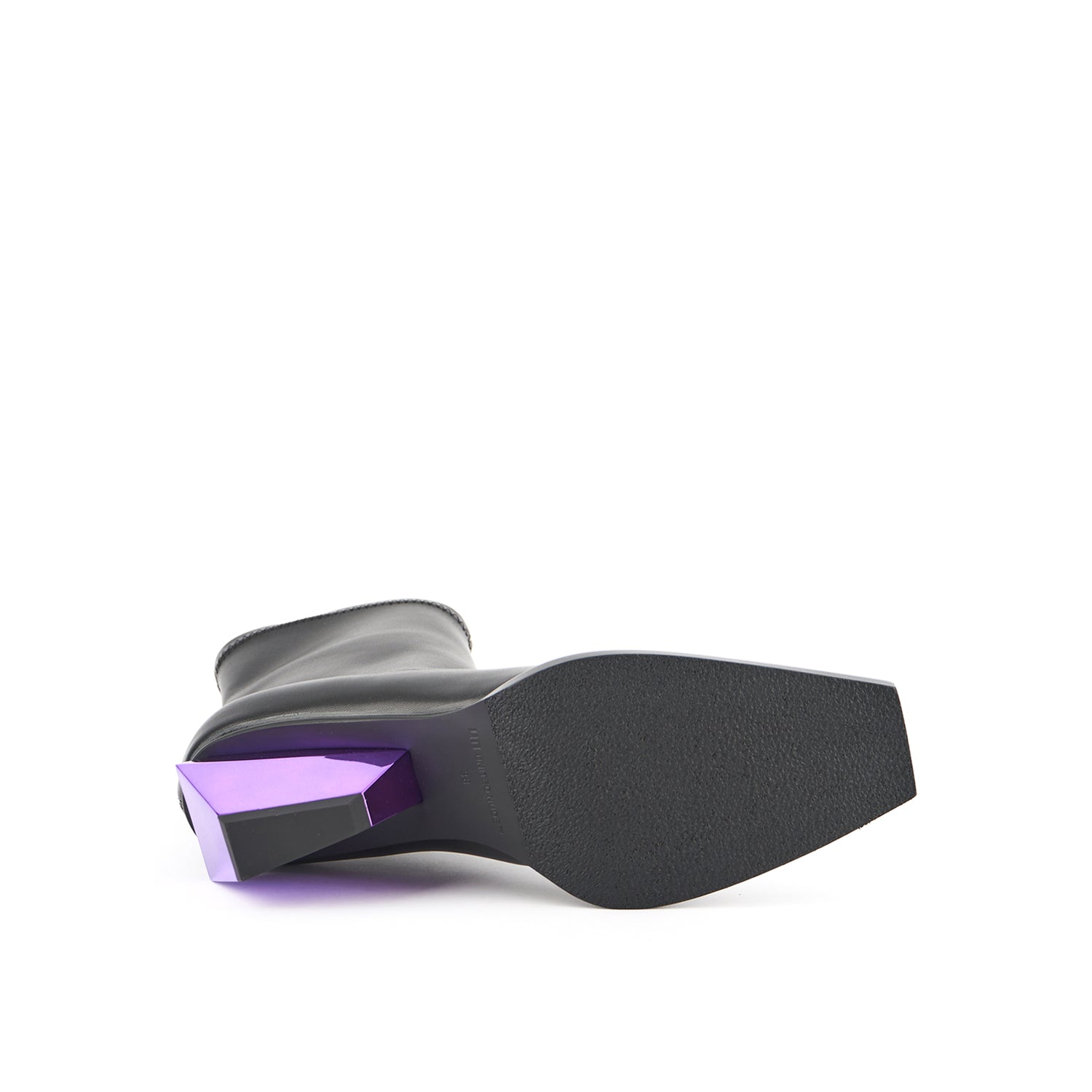 Der Jacky X ist eine Slip-On Lederstiefelette mit spitzer Zehenpartie, scharfen diagonalen Linien, geraffter Oberkante und einem geometrischen kristallähnlichen Absatz. Ein elastischer Schaft sorgt für minimalistische Optik. Diese moderne Stiefelette verkörpert avantgardistische Schuhmode und ist perfekt für trendbewusste Frauen, die einen einzigartigen Look schätzen.