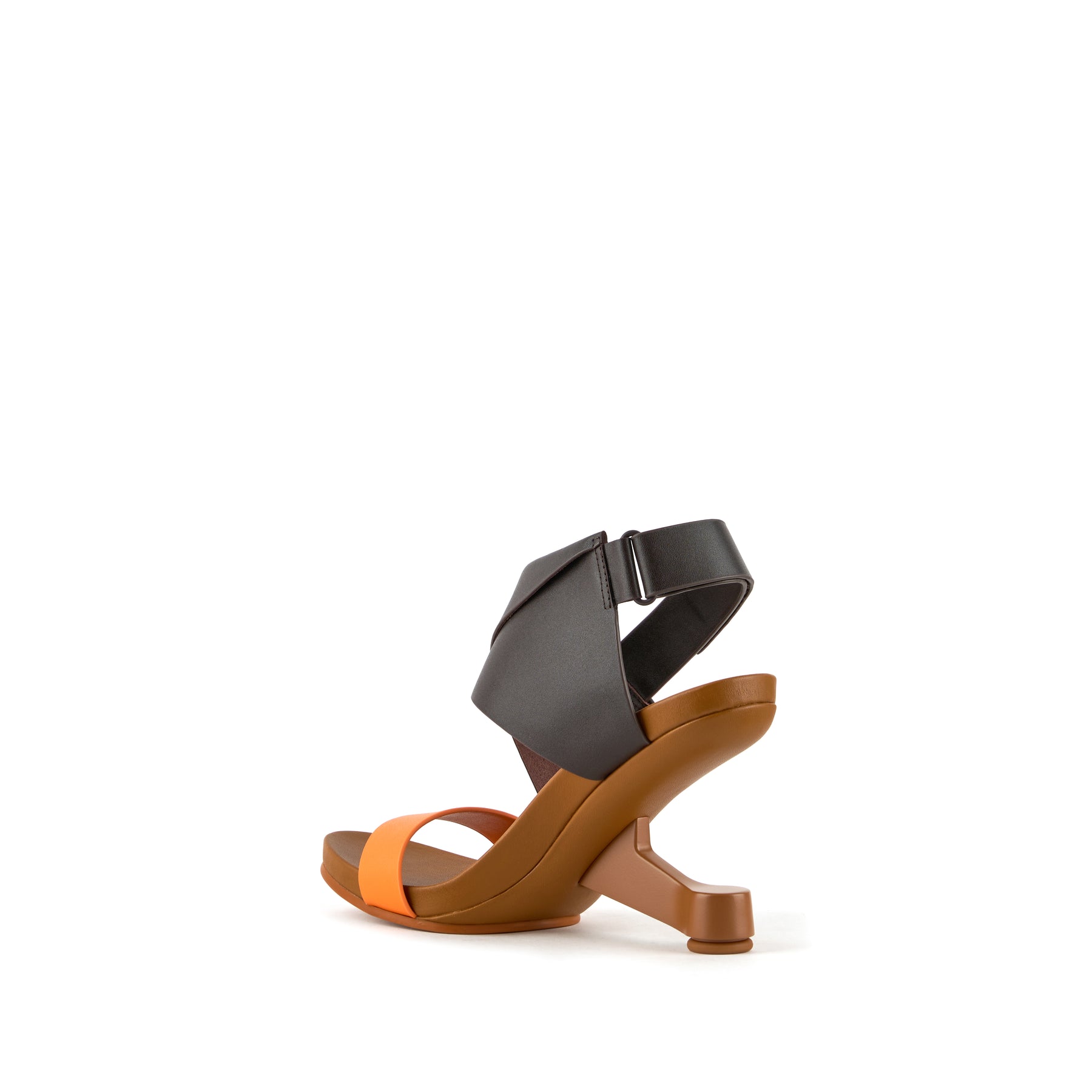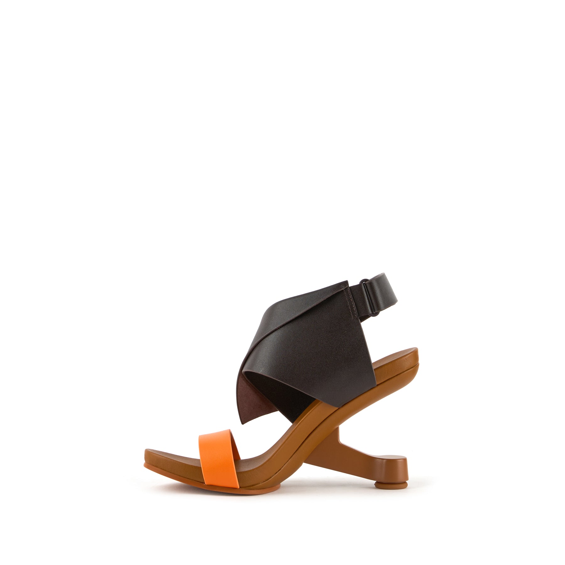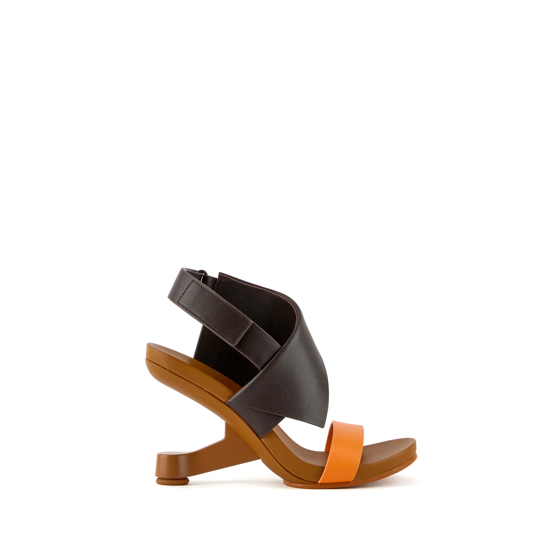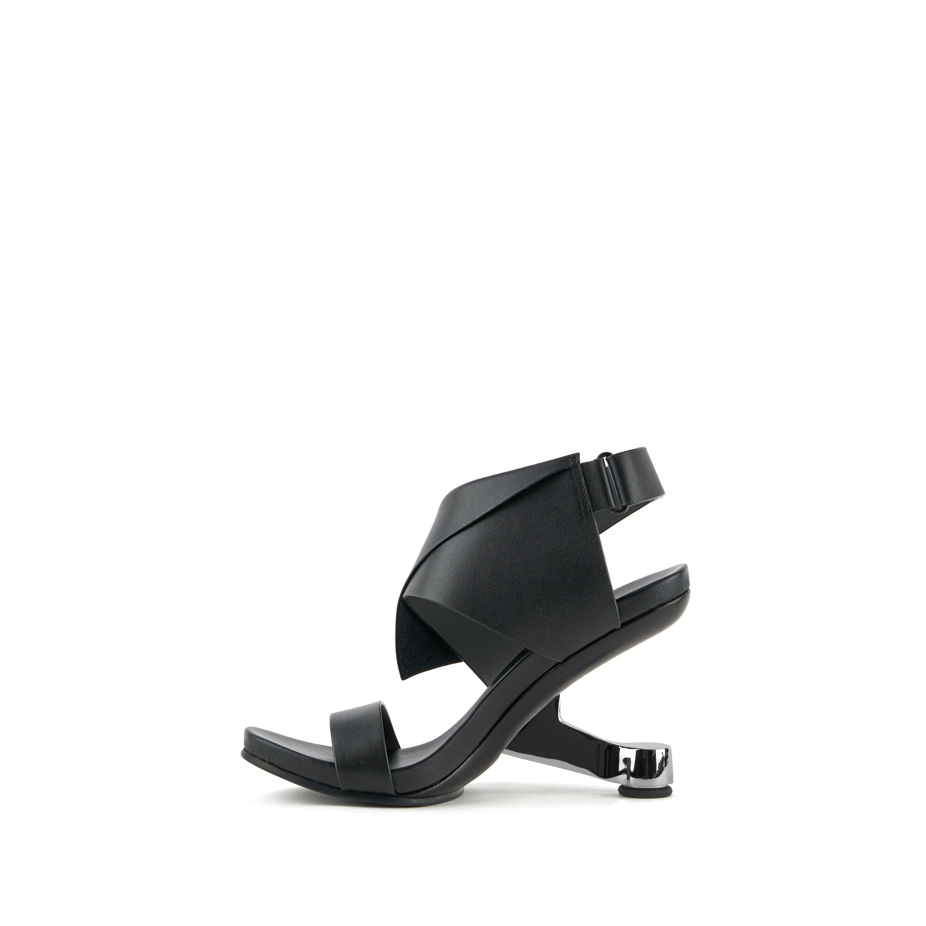 The Eamz Polo is a high-heeled sandal that combines architectural design with contemporary elegance. Featuring an overlapping leather upper and an adjustable ankle strap, it ensures a secure, comfortable fit while making a bold visual statement.